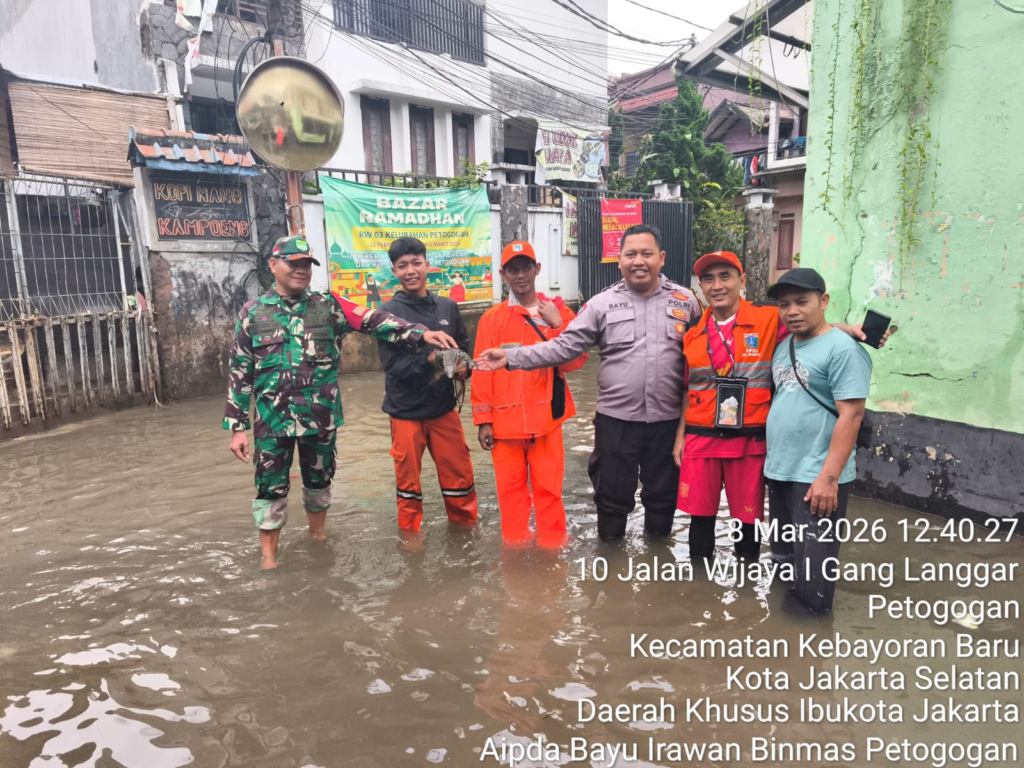 Jakarta Selatan – Bhabinkamtibmas Kelurahan Petogogan Aipda Bayu Irawan bersama Babinsa Kelurahan Petogogan, Bapak Madinah selaku Ketua RT 03 RW 03, serta petugas PPSU melaksanakan pengecekan langsung kondisi genangan air di wilayah RW 01, RW 02, dan RW 03 Kelurahan Petogogan, Kebayoran Baru,(8/3/2026).